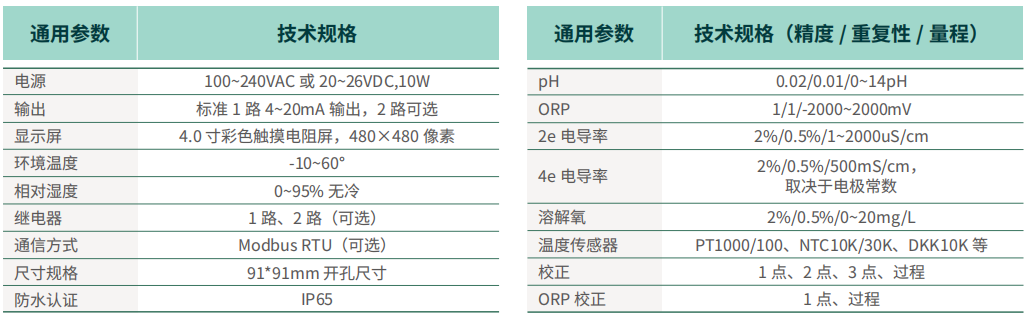 • A versatile transmitter supporting various measurement parameters, including pH/ORP, conductivity/resistivity, dissolved oxygen, turbidity/MLSS/sludge concentration, residual chlorine/chlorine dioxide/total chlorine, and ion electrodes (ammonia nitrogen, nitrate nitrogen, fluoride ions, chloride ions), etc.