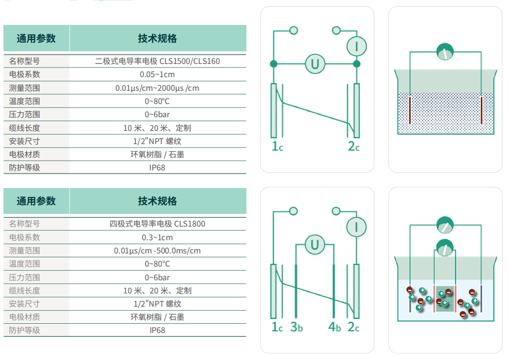 - Dual-electrode/quad-electrode design covers multiple ranges of conductivity measurement.